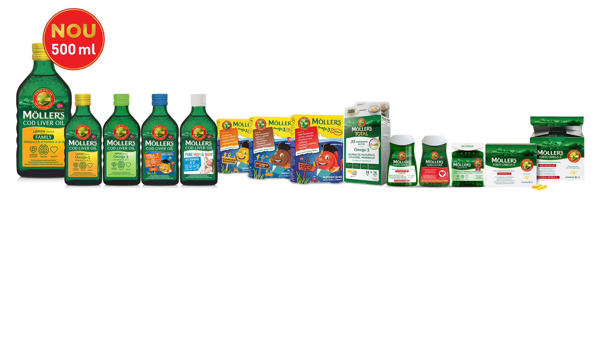 - Möller’s Lemon Flavour FAMILY 500 ml este cel mai nou produs din familia Möller’s, în format economic, cu 100 doze (a câte 5 ml) și poate fi consumat de către toți membrii familiei, de la copiii de peste 3 ani și până la părinți și bunici. Susține dezvoltarea inteligenței, sănătatea inimii, dar și sistemul imunitar.