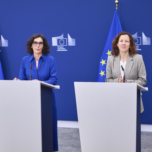 Roxana Mînzatu, vicepreședinte executiv al Comisiei Europene, și Hadja Lahbib, comisar pentru Egalitate, la prezentarea răspunsului Comisiei la Inițiativa Cetățenească Europeană „My Voice, My Choice”, privind utilizarea fondurilor UE pentru sprijinirea accesului la avort sigur și legal.