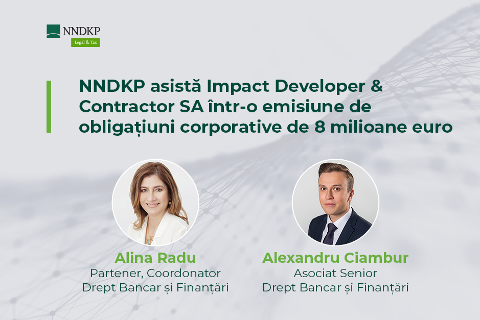 Alina Radu, partener NNDKP: „Suntem extrem de bucuroși că am putut susține Impact Developer & Contractor în legătură cu obținerea acestei finanțări pentru dezvoltarea proiectelor pe care le are în plan și consolidarea poziției sale pe piața imobiliară din România. Le mulțumim pentru încrederea acordată și le urăm mult succes pe mai departe.”