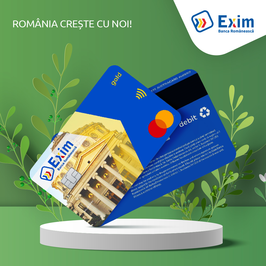 Exim Banca Românească anunță că, din această lună, emite cardurile Mastercard Debit Gold fabricate din material reciclabil.