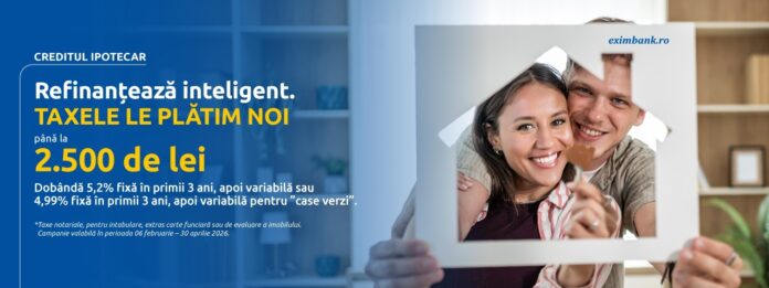 Astfel, pentru cei care solicită până la 30 aprilie 2026 un credit de investiții imobiliare pentru refinanțare, Exim Banca Românească acoperă, în limita a 2.500 de lei, cheltuielile asociate acestei tranzacții precum taxe notariale pentru autentificarea contractului de ipotecă, taxe pentru intabularea ipotecii în cartea funciară, taxe eliberare extrase carte funciară, taxa de evaluare imobil adus în garanție etc.”