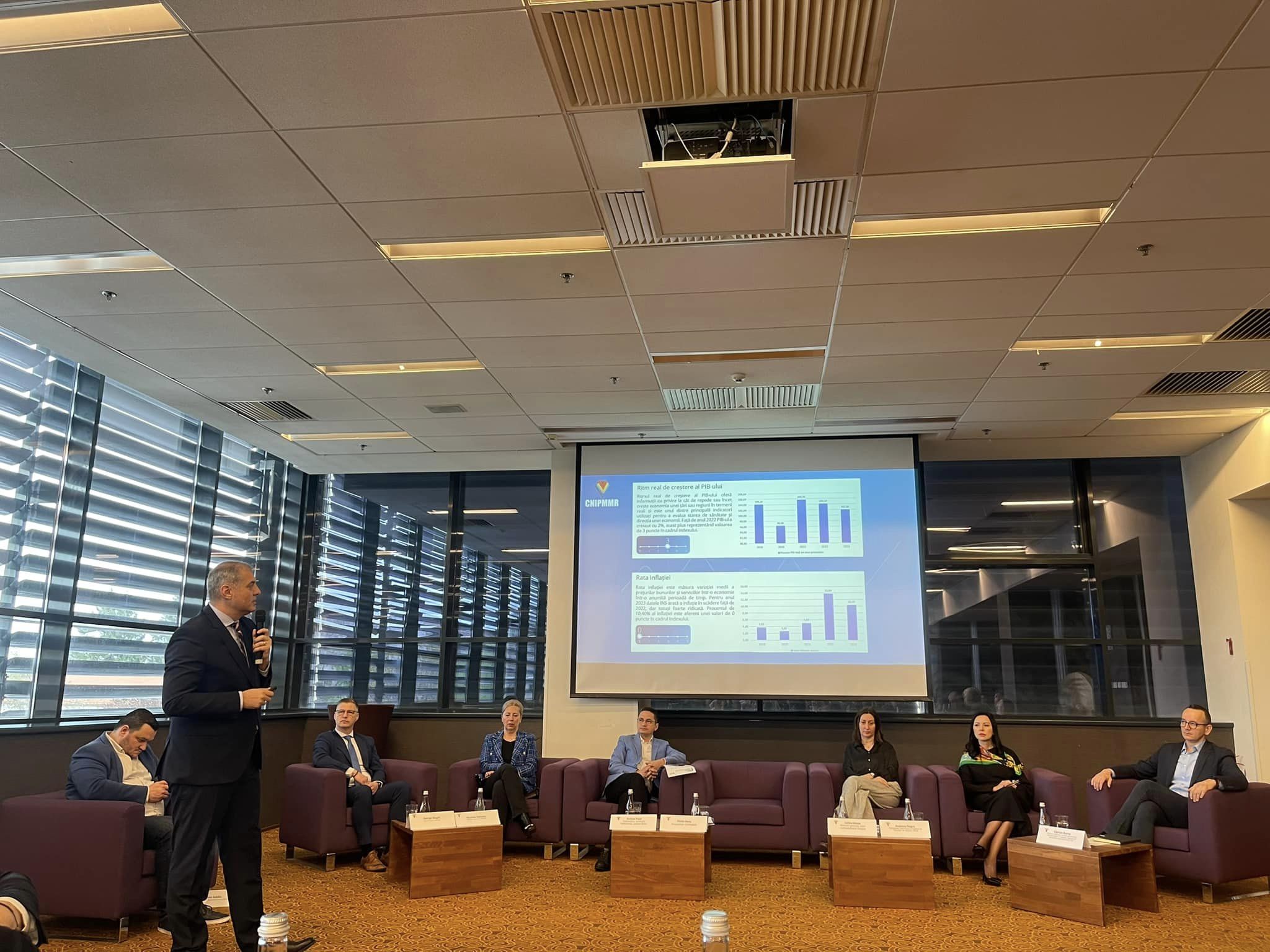 Florin Jianu, președinte CNIPMMR: „Suntem onorați să ne aflăm astăzi la Oradea la cel de-al treilea eveniment sub egida vorbIMM despre: Regenerarea României. Astăzi doresc să vă prezint cea mai nouă analiză macroeconomică extrem de complexă realizată de CNIPMMR, Indexul Antreprenoriatului Românesc. Încep prin a vă spune că perspectiva antreprenoriatului românesc, dintr-un scor maxim de 100 se află la 49 de puncte în acest moment, indicând un antreprenoriat moderat. Din perspectiva ritmului de creștere a PIB-ului, contribuția acestuia la index este de 3, ca urmare a unei creșteri constante în ultimii ani a PIB-ului, respectiv 2 % în 2023. Singurul scor din index care înregistrează o notă maximă este stabilitatea cursului de schimb care, în ultimii ani, a avut o variație foarte mică de 1,6 % față de medie. În urma analizei de percepție, s-a constatat că antreprenorii români au mai multă încredere în companiile proprii și mai puțină în politicile publice. Totuși, mediul antreprenorial înregistrează performanțe superioare anului precedent.”