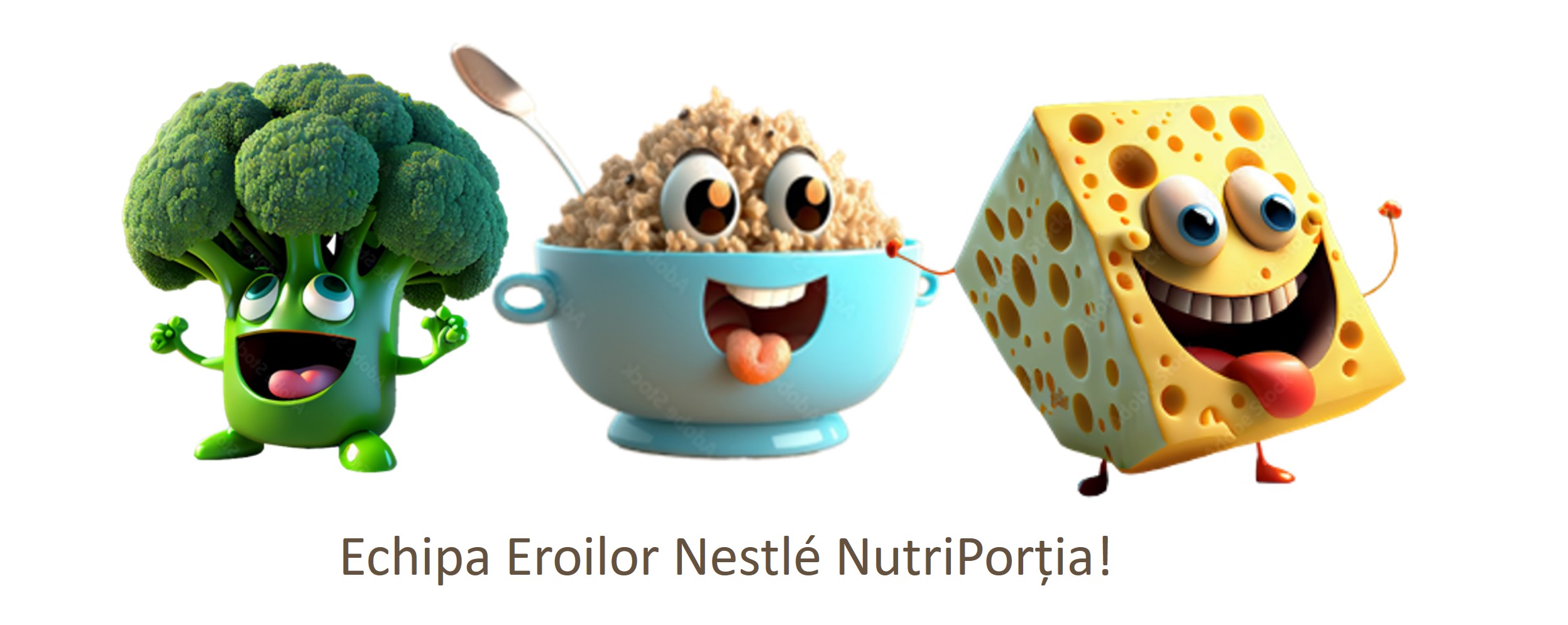 Cele trei personaje sunt iterații ale secțiunilor din farfuria NutriPorția care îți arată care sunt cantitățile potrivite din fiecare grupă de alimente pentru principalele mese ale zilei: jumătate din farfurie să fie acoperită de legume și verdețuri, un sfert – de alimente bogate în proteine, iar un sfert – de cereale/paste/orez și alte surse de carbohidrați. În plus, pe marginea farfuriei găsești câteva recomandări pentru restul grupelor de alimente: pentru că fructele, nucile, lactatele sau apa sunt și ele esențiale pentru o alimentație sănătoasă. Principiile NutriPorția au stat la baza dezvoltării Cărții de rețete Nestlé alături de Chef Ștefan Popescu, care ține cont atât de gust, dar și de varietate, aport caloric adecvat și un raport corect al macronutrienților în meniul zilnic. Această carte de rețete poate fi descărcată gratuit de pe site-ul Nestlé și utilizată de cei mici și mari deopotrivă.