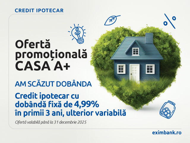 Exim Banca Românească anunță lansarea ofertei promoționale Casa A+, caracterizată ca „soluție de finanțare ipotecară cu dobândă fixă de 4,99% în primii 3 ani, ulterior variabilă, care încurajează investițiile în locuințe eficiente energetic oferind totodată protecție împotriva fluctuațiilor de dobândă”.