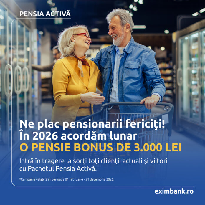 Exim Banca Românească ne informează că, pe parcursul întregului an, „va acorda un premiu lunar constând într-o pensie suplimentară, în valoare de 3.000 de lei, clienților care dețin sau achiziționează pachetul de cont Pensia Activă în perioada 02 februarie-31 decembrie 2026. La tragerea la sorți lunară vor fi incluși automat toți clienții care au încasat pensia de la casele de pensii în luna precedentă, ultima tragere la sorți fiind programată pentru 15 decembrie 2026.